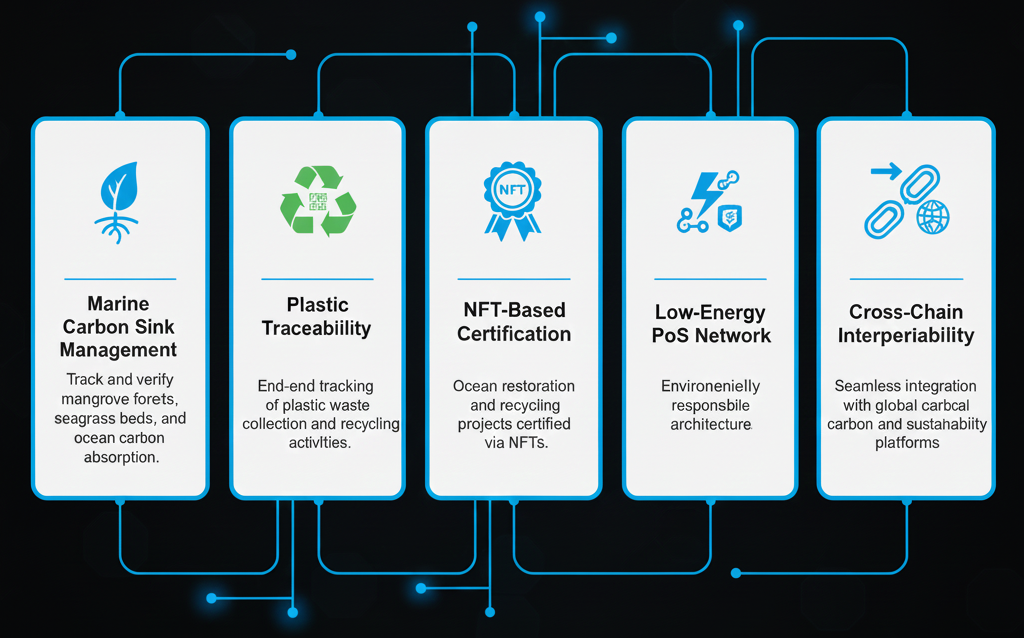 The network adopts a Proof-of-Stake (PoS) consensus mechanism, supports smart contract development, and integrates an NFT marketplace for certifying marine environmental projects and recycling activities. Its overall architecture is comparable to Ethereum, but it is purpose-built for ocean-focused applications such as mangrove carbon sinks, seagrass bed restoration, and plastic waste traceability.